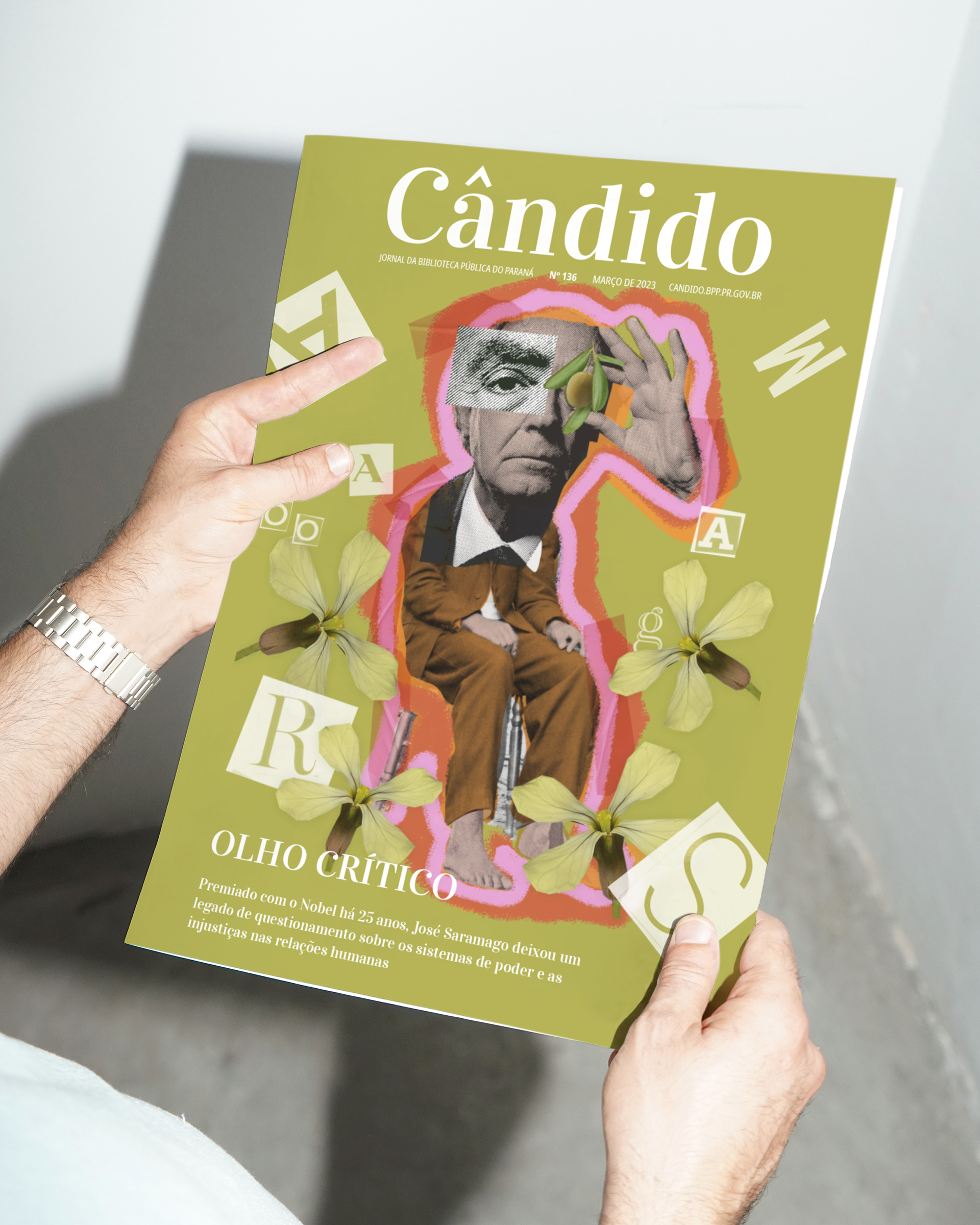 Collages for the Magazine Cover <Cândido>, n 136, in a special report about José Samarago edited by the Journal from Biblioteca Pública do Paraná. In Juliana Sehn's report, scholars of the Portuguese writer's work comment on passages from his career and discuss his legacy — marked by a critical view of the world and denunciation of social injustices. The material also includes an interview with the writer's daughter, Violante Saramago, and testimonies from fans who accompanied him during his only visit to Curitiba, in 2000.